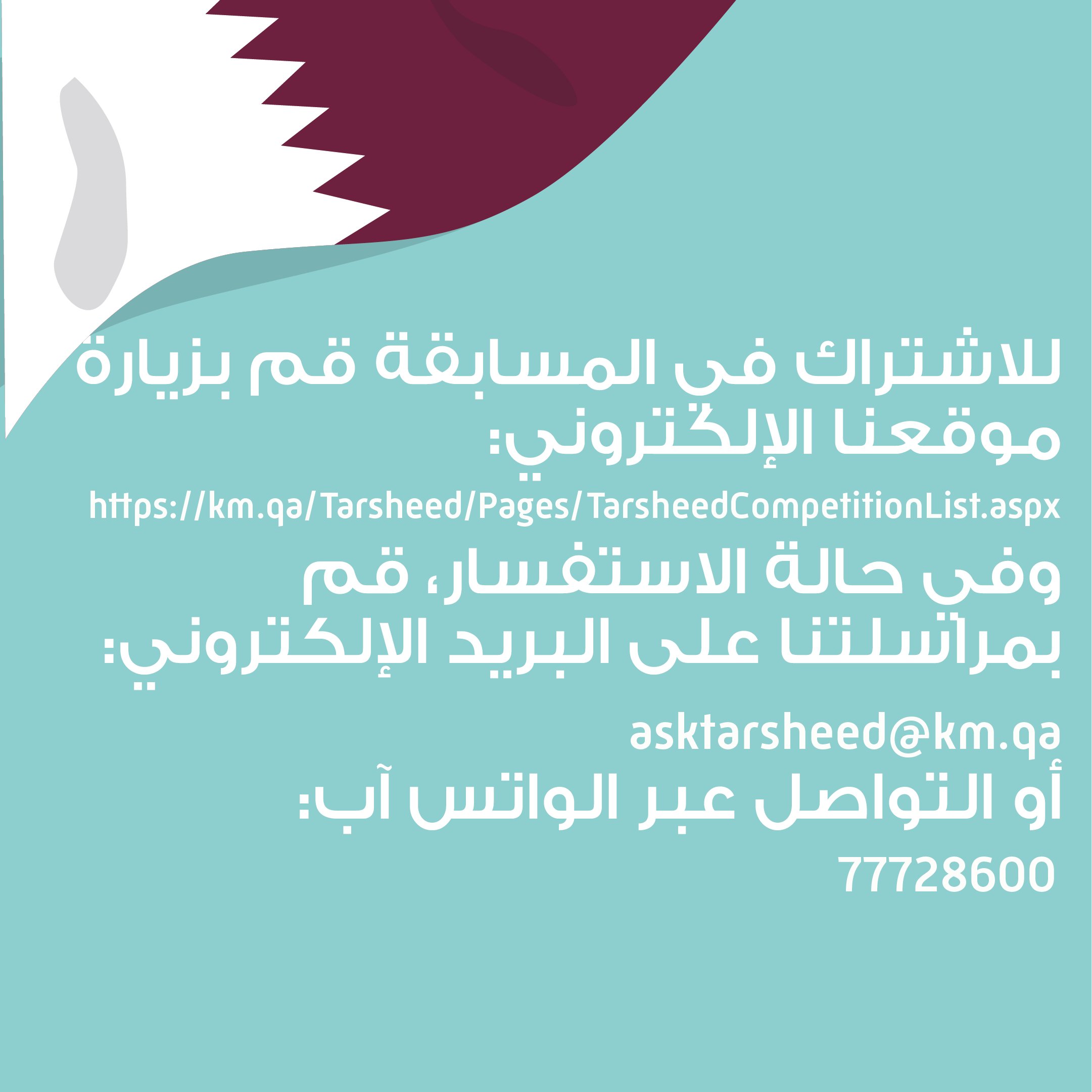 We thank you once again for your keenness and interest to participate in Tarsheed monthly competition, the second version, which is a challenge and competition between Qatari families to achieve the lowest consumption of electricity and water, and aims to encourage and consolidate the concept of rationalization among families, and valuable prizes will be allocated to the participants with the highest percentage of reduction. It will be over a period of 3 months (January-February-March) of the year 2021, the last day for registration will be: 12/31/2021